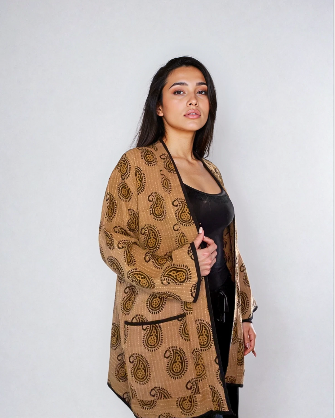 È realizzata con tessuti Kantha vintage recuperati in India, cuciti a mano e trasformati in una giacca che porta con sé carattere, storia e libertà.