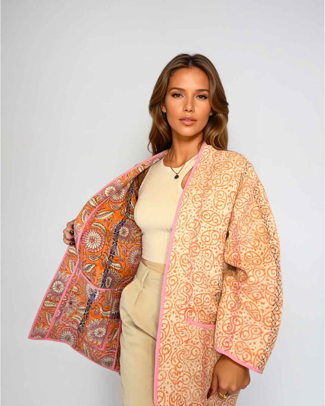 È realizzata con tessuti Kantha vintage recuperati in India, cuciti a mano e trasformati in una giacca che porta con sé carattere, storia e libertà.