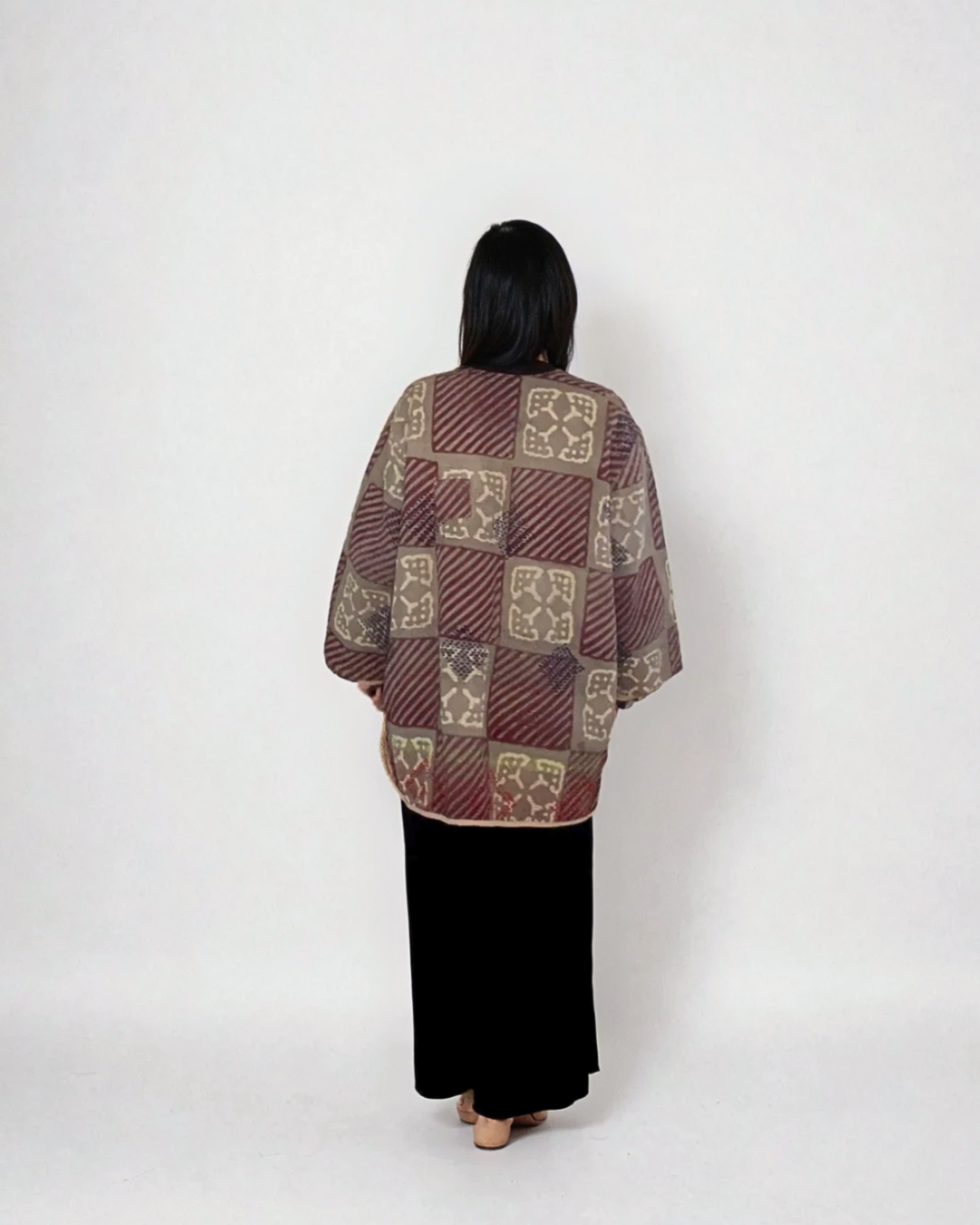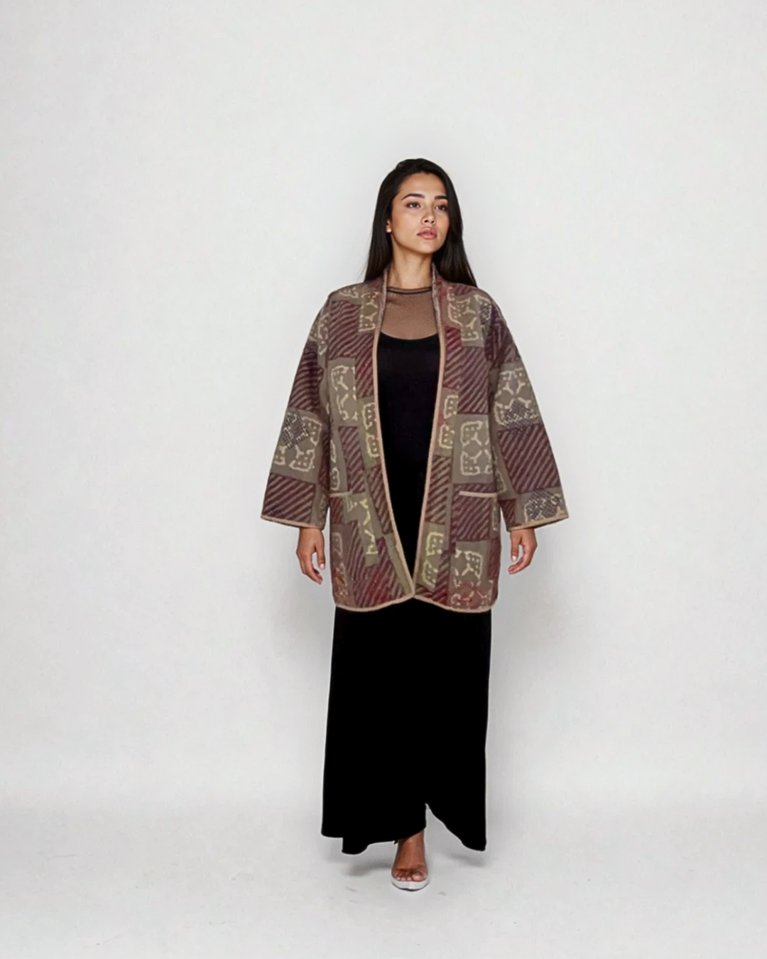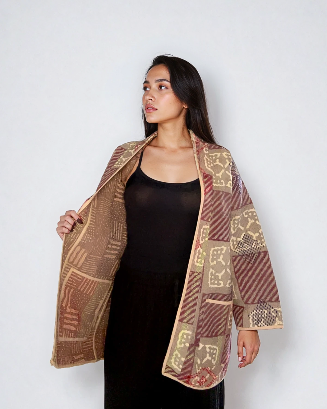 È realizzata con tessuti Kantha vintage recuperati in India, cuciti a mano e trasformati in una giacca che porta con sé carattere, storia e libertà.