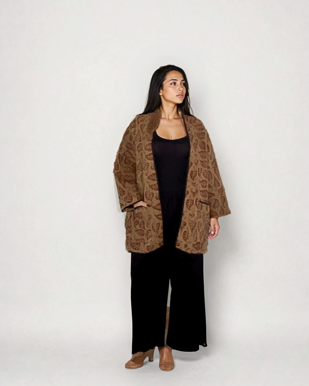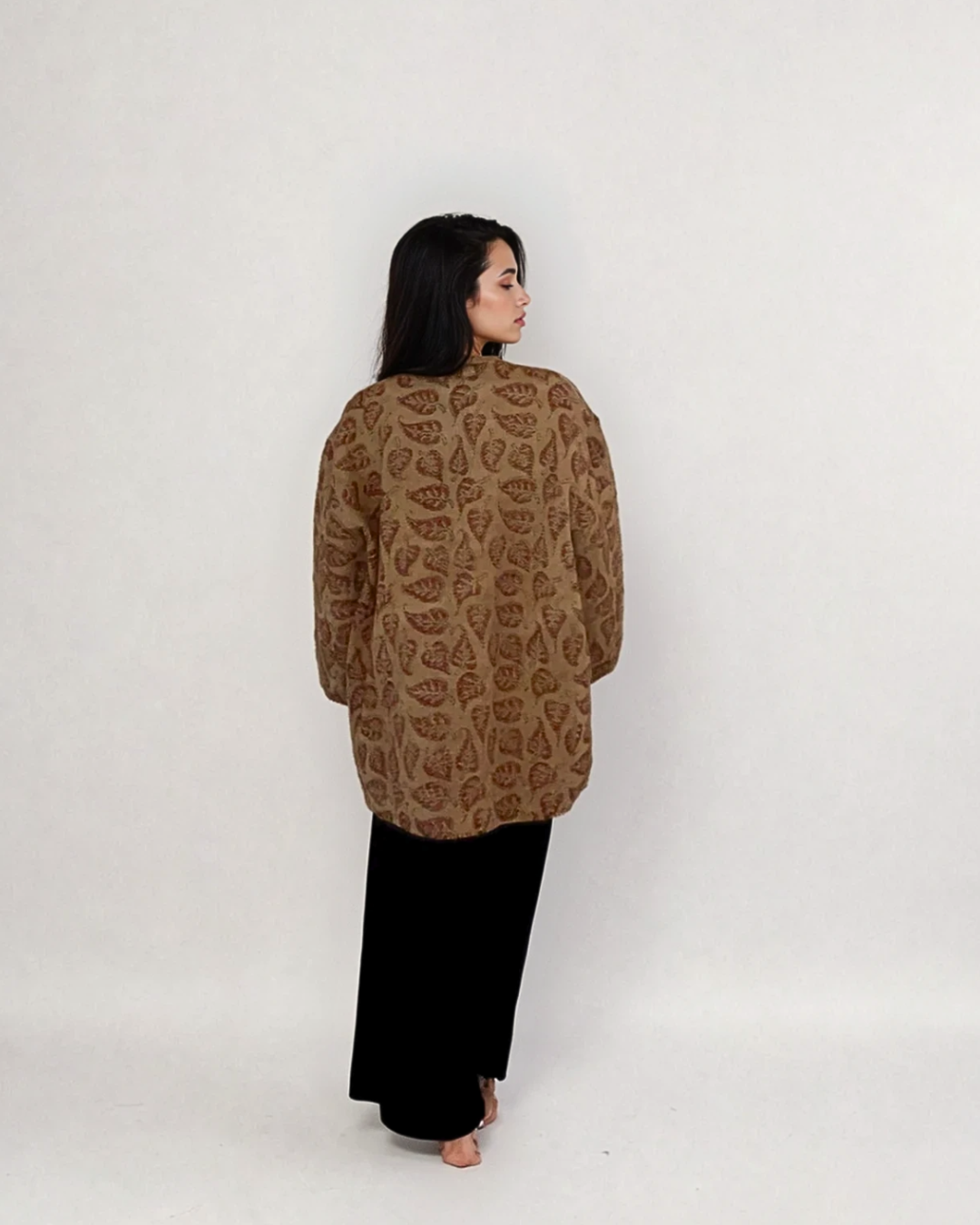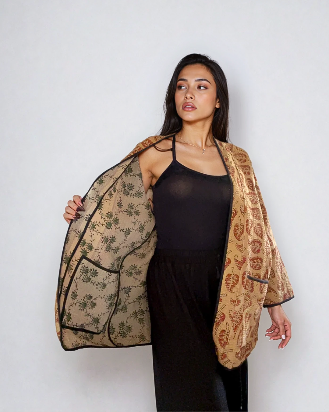 È realizzata con tessuti Kantha vintage recuperati in India, cuciti a mano e trasformati in una giacca che porta con sé carattere, storia e libertà.