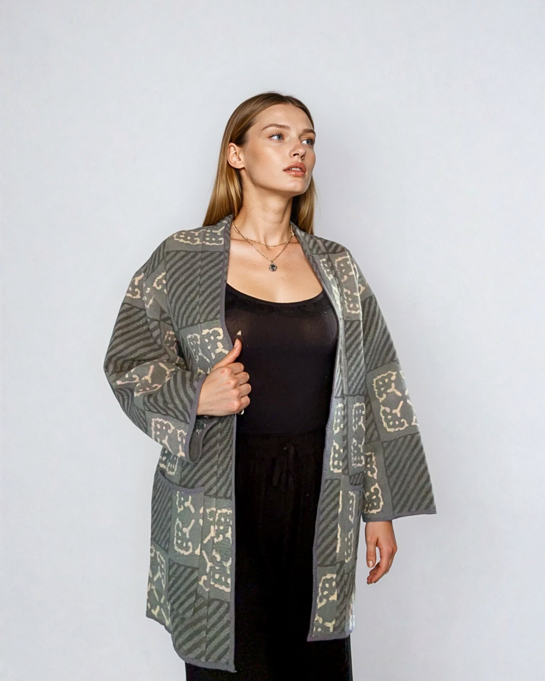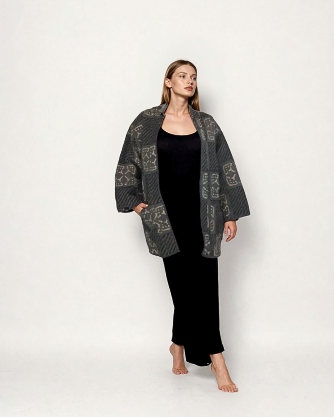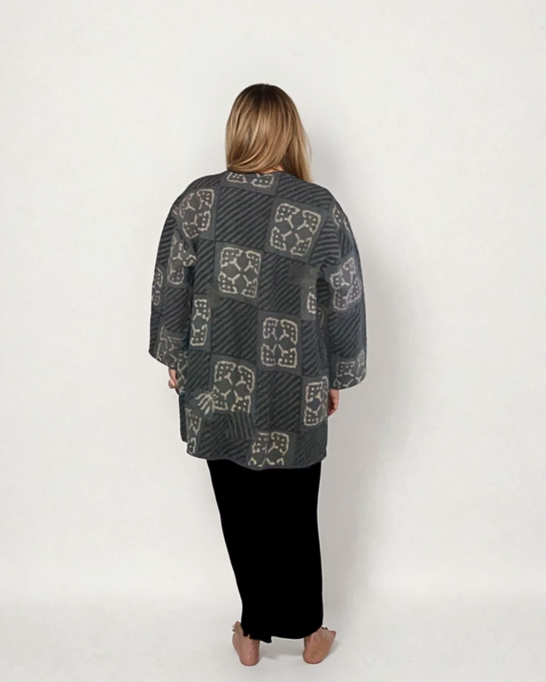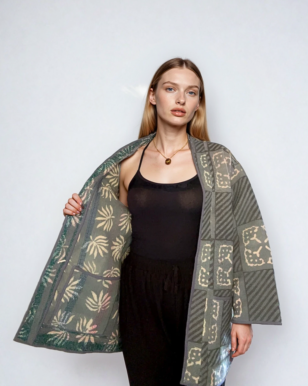 È realizzata con tessuti Kantha vintage recuperati in India, cuciti a mano e trasformati in una giacca che porta con sé carattere, storia e libertà.
