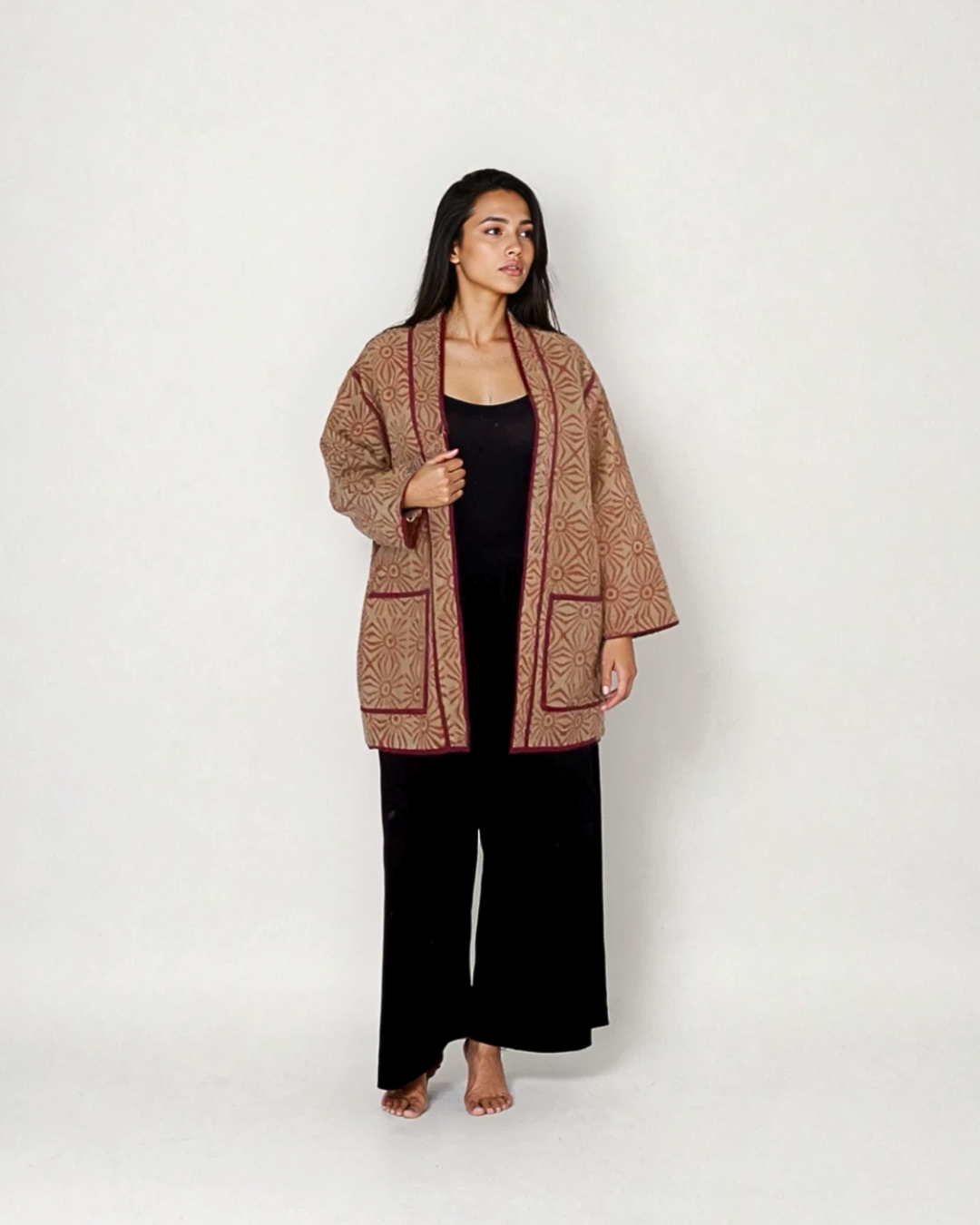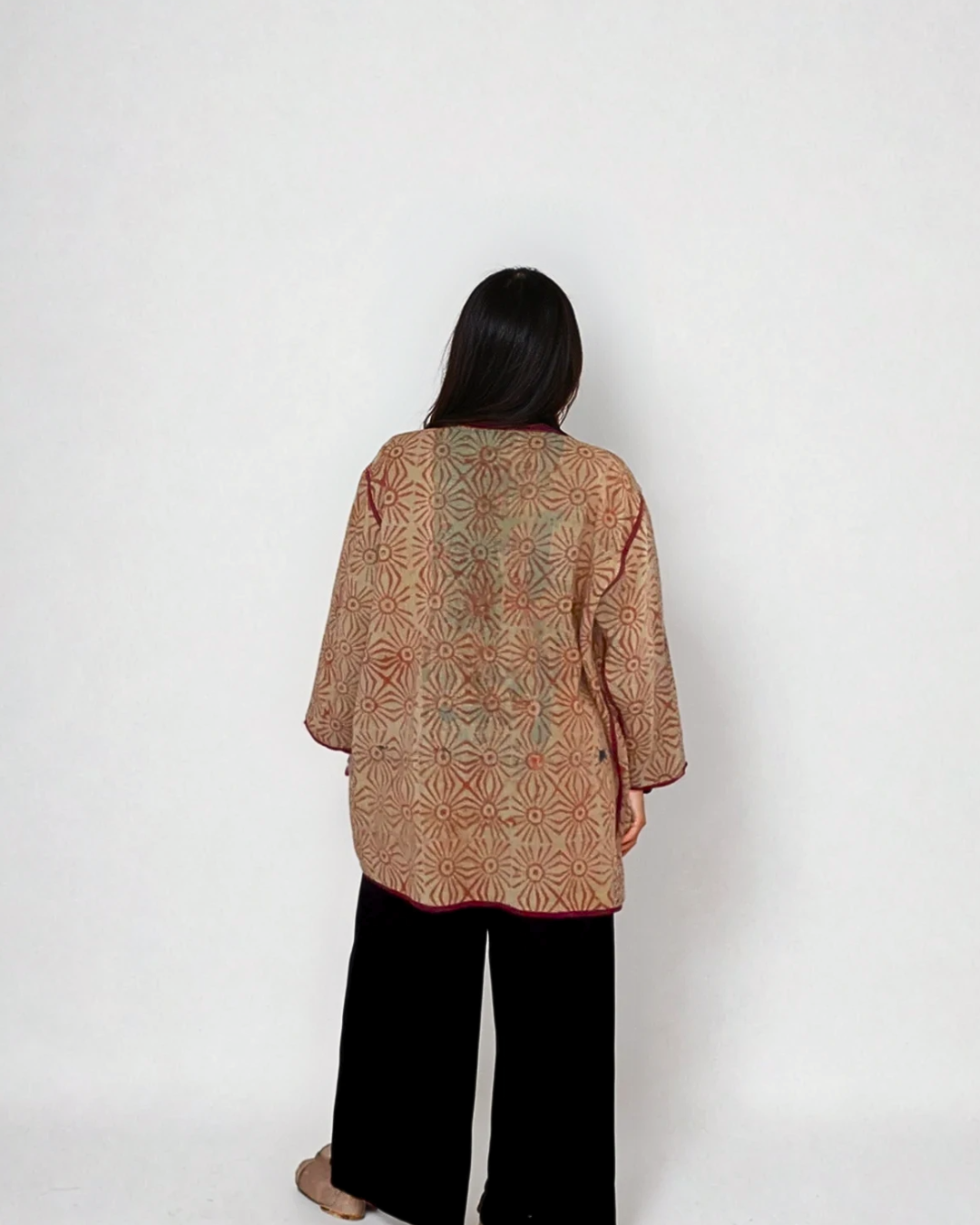 È realizzata con tessuti Kantha vintage recuperati in India, cuciti a mano e trasformati in una giacca che porta con sé carattere, storia e libertà.