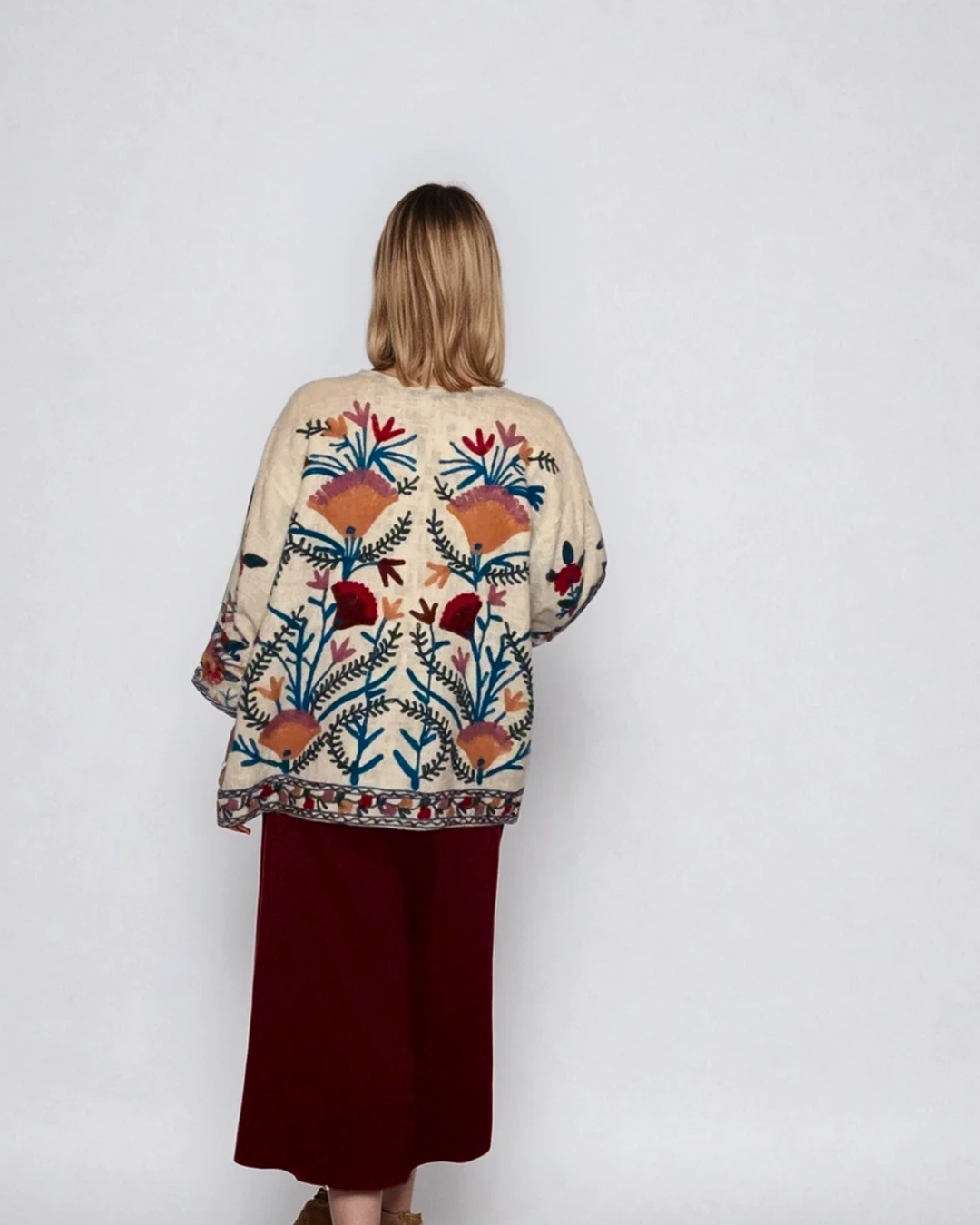 Suzani in Fiore è una giacca artigianale realizzata in cotone ricamato, pensata per donne che desiderano distinguersi con naturalezza.