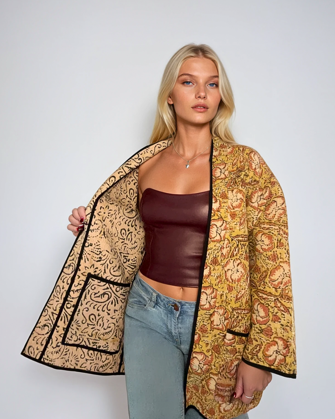 È realizzata con tessuti Kantha vintage recuperati in India, cuciti a mano e trasformati in una giacca che porta con sé carattere, storia e libertà.