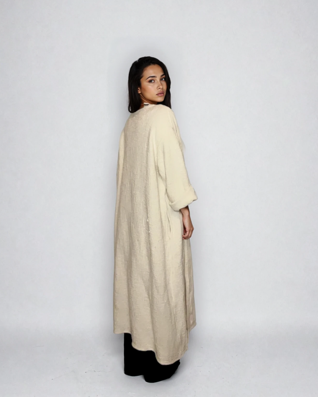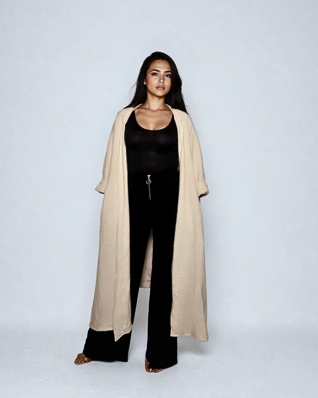 Il tessuto grezzo e morbido avvolge senza appesantire, offrendo comfort e naturalezza in ogni momento della giornata.